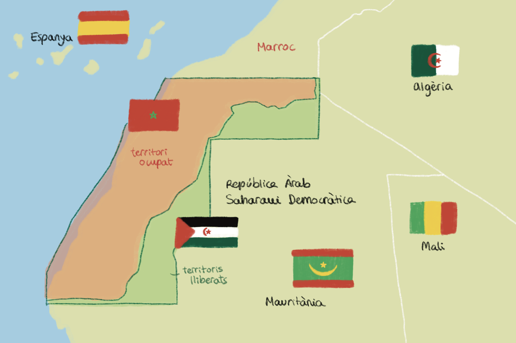 El Sàhara Occidental va ser colònia espanyola fins al 1975. Aquell any, en plena època franquista, Espanya va abandonar el territori a través dels Acords Tripartits de Madrid, cedint-ne el control a Marroc i Mauritània. Aquesta sortida precipitada va deixar el territori en mans d’una ocupació militar, ja que no es va garantir cap procés d’autodeterminació per al poble sahrauí.