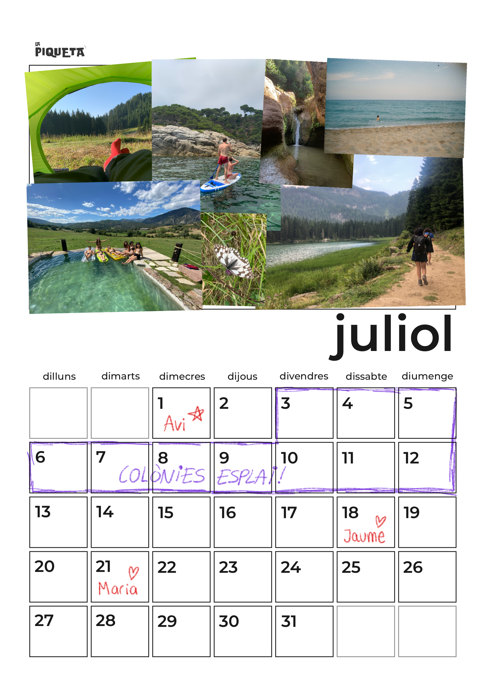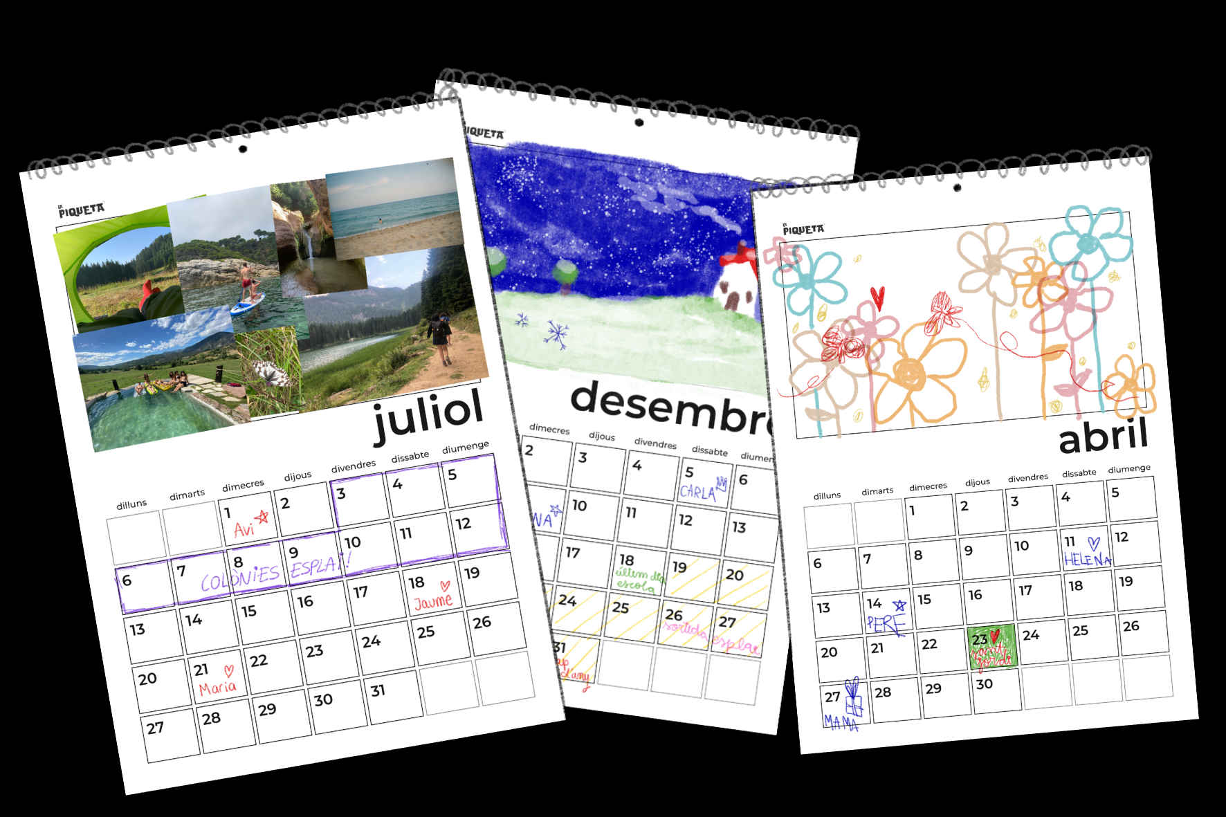 Hi pots apuntar els aniversaris dels amics, la família i les dates assenyalades (sortides amb l’esplai, examens, dates assenyalades…). Pots fer-hi dibuixos, enganxar-hi un collage amb revistes velles, escriure-hi frases que t’agradin, entrades de concerts, stickers o fotos dels amics, la família o moments especials. També pots utilitzar el calendari per a enganxar-hi les teves fotos preferides de cada mes, de manera que en acabar l’any tindràs un record únic de tot el que has fet!