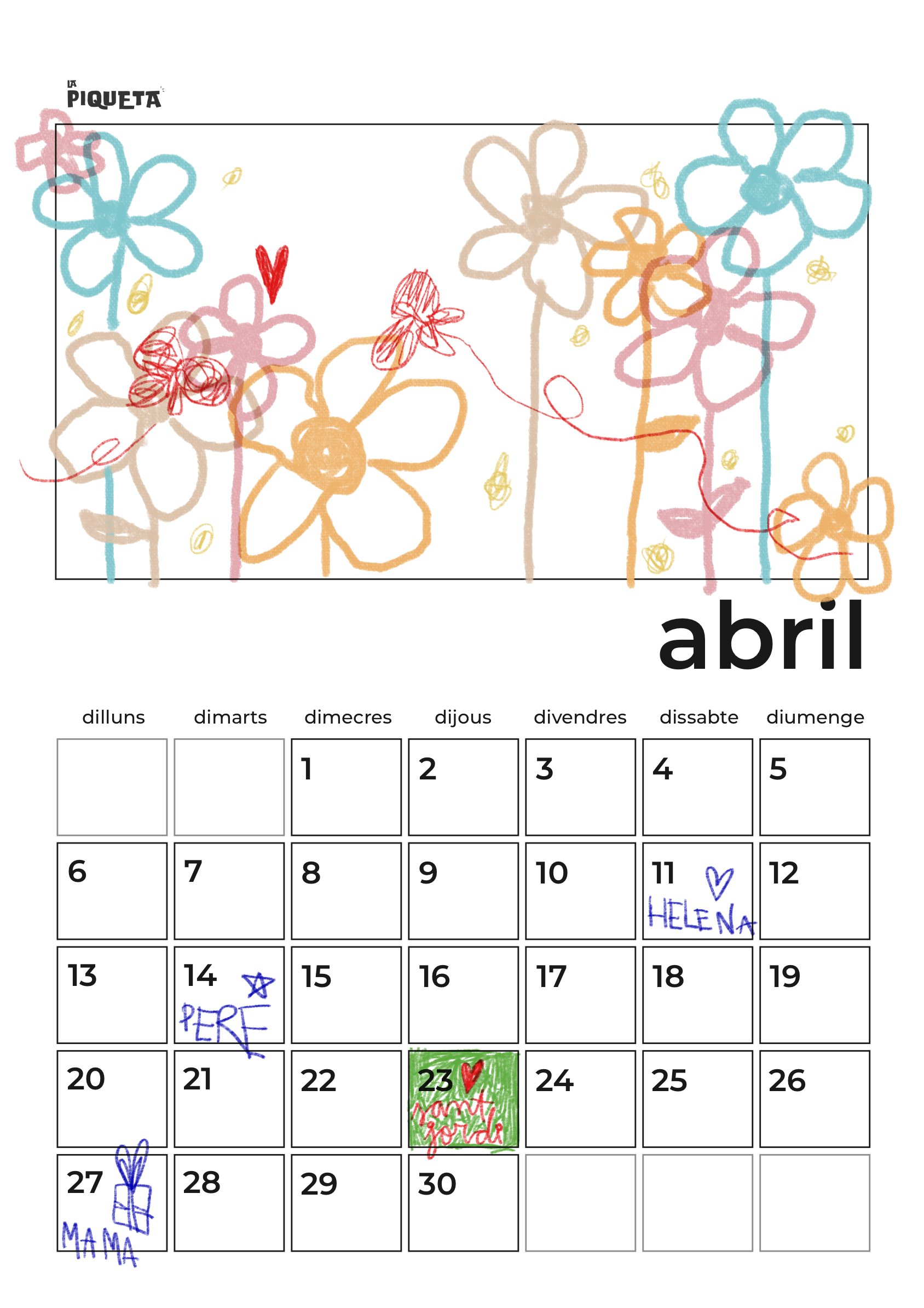 Quan el tinguis llest, només cal portar-lo a una copisteria perquè t’hi posin una espiral. Costa pocs diners… i tindràs un calendari fet per tu. 🖍️✨